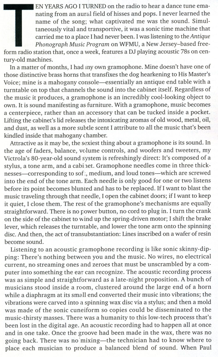 Hanging on the Gramophone - How an 80-year-old piece of furniture can make such sweet, sweet music by Myla Goldberg* Spin Magazine, November 2006