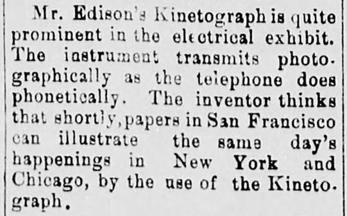She then writes that "Mr. Edison's Kinetograph is quite prominent in the electrical exhibit. The instrument transmits photographically as the telephone does phonetically. The inventor thinks that shortly, papers in San Francisco can illustrate the same day's happenings in New York and Chicago, by the use of the Kinetograph."