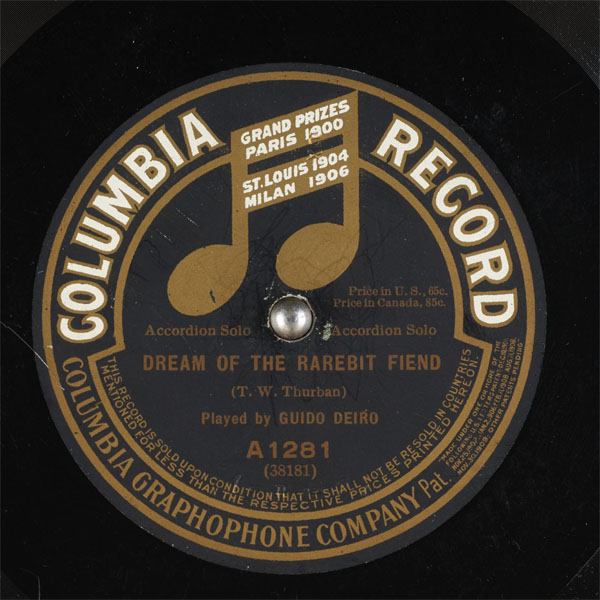 The 1912 Columbia 78 rpm disc "Dream of the Rarebit Fiend" performed as an accordian solo by Guido Deiro is here courtesy of the Internet Archive.