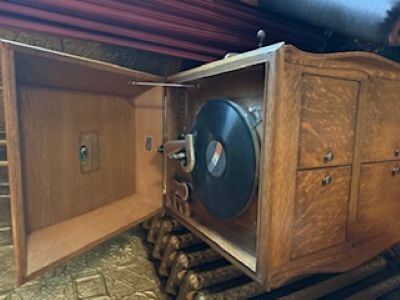 An oak Victrola stands near the stately entrance and staircase of the Molly Brown House Museum in Denver, Colorado. "In 1926, Margaret turned the home into a boarding house under the supervision of her housekeeper. (Wikipedia). Margaret (Molly) Brown often traveled and I don't know the history of this machine and whether or not this is a "period piece" addition to the house or was owned by Molly Brown, so at this time it's TBD. Either way, when Friends of the Phonograph (in this case Terry Petersen and her two granddaughters in 2026) see a Victrola in an historic house, that Victrola becomes a Phonograph "Sighting" and gets its place in this gallery.