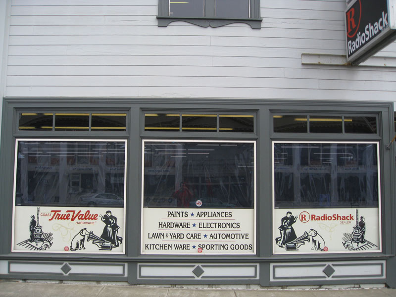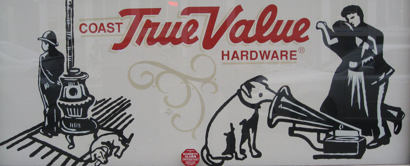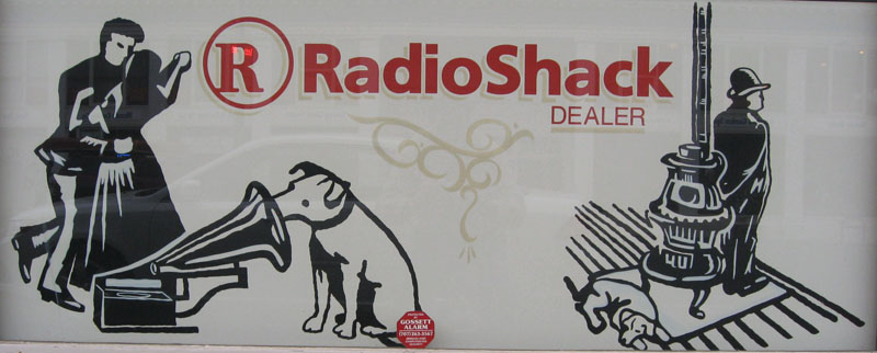PhonoLinks 2011 August 2011 - Fort Bragg, CA Nipper in a new advertisement for Radio Shack and True Value Hardware This storefront on Highway 101 in Ft. Bragg, CA, represents another round for Nipper and the gramophone in marketing. r