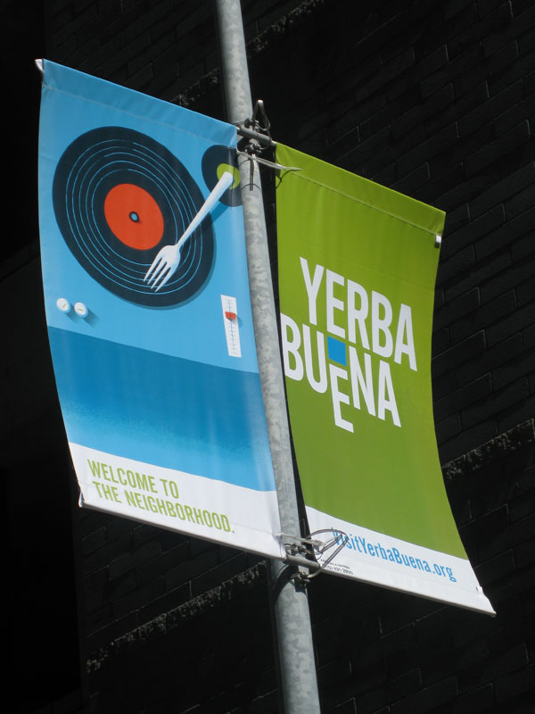 PhonoLinks 2011 August 2011 - San Francisco Turntable icon welcomes visitors to Yerba Buena Neighborhood Banners on lightposts in downtown San Francisco include a turntable stylized to represent dining. The Yerba Buena website states the following: "Yerba Buena is a San Francisco neighborhood of artists, patrons, urbanistas, fashionistas, movie lovers, night clubbers, shop keepers, score keepers, entrepreneurs, restauranteurs, worker bees, retirees, technologists and mixologists." www.visityerbabuena.org