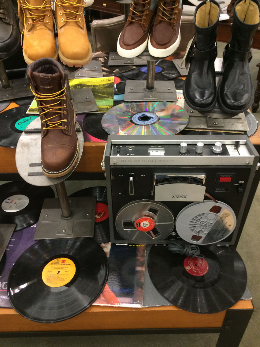 Sony reel-to-reel tape recorder, 33 1/3 vinyl records and album covers and laser disc provide ambience for selling shoes.