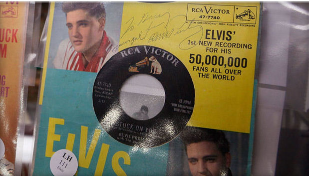 Elvis Presley-autographed 45 RPM records are displayed at a Chicago auction house in this 2009 file photo. RCA Victor unveiled the new breed of phonograph record on January 10, 1949, and it became the standard for Top 40 hits and the ubiquitous jukebox. / Scott Olson/Getty Images