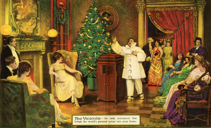 This Victrola 1919 advertisement with Caruso performing in the home illustrates the advertising approach and popularity of the Victrola.
