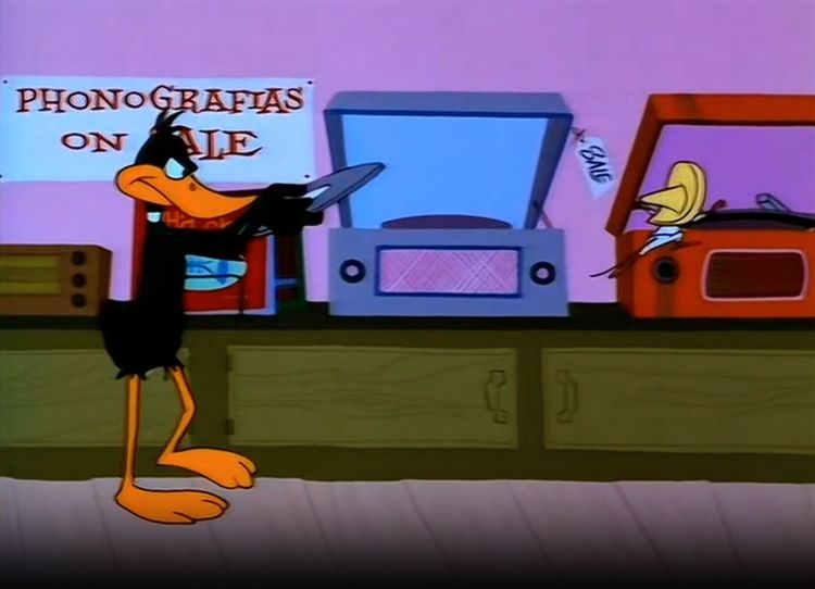 In the 1965 Warner Bros. cartoon, "Go Go Amigo," Daffy isn't running for President but he is in a music store running after Speedy Gonzales who is driving Daffy nuts by putting on a record and then running to the next phonograph and playing another record.
