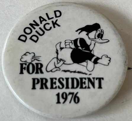Donald Duck never ran for President but he had his supporters. This pin is vintage 1976 support.