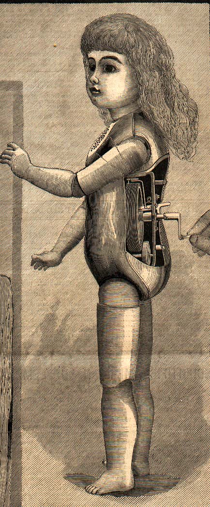 phonograph mechanism inside doll (engraving) |