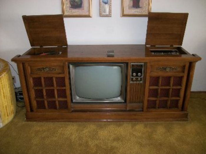 Sharon doesn't recall a TV being part of any home entertainment console and instead remembers a stand-alone TV in the living room and a combo Phono/Radio console in the kitchen where she would lay on the floor for hours and play "4 Way Street" repeatedly on its turntable.