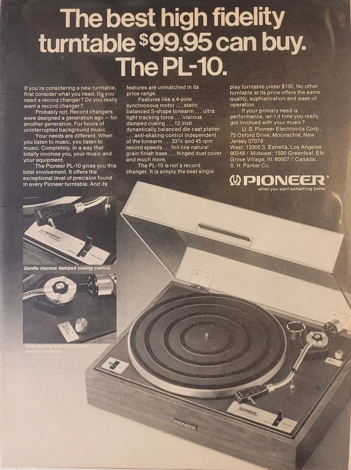 The Pioneer PL-10 was an entry level, manual, belt drive turntable. A Pioneer magazine ad from 1974 promoted it as "The best high-fidelity turntable $99.95 can buy. The PL-10."