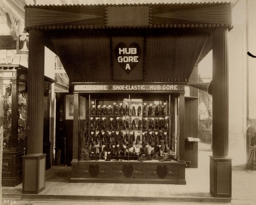 Hub Gore Shoe Display in Manufacturers Building. Note the Edison Concert Phonograph and its horn in the upper right of the display which may have been used for advertising Hub Gore Shoes with a recording of Uncle Sam promoting the shoes. Photograph by Rinehart.