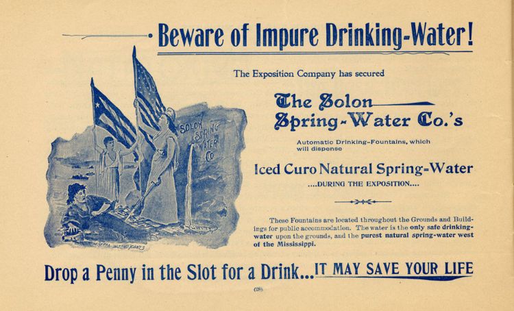 Salon Spring Water Automatic Drinking Fountains at the 1898 Exposition. "Drop a Penny in the Slot for a Drink. It May Save Your Life."