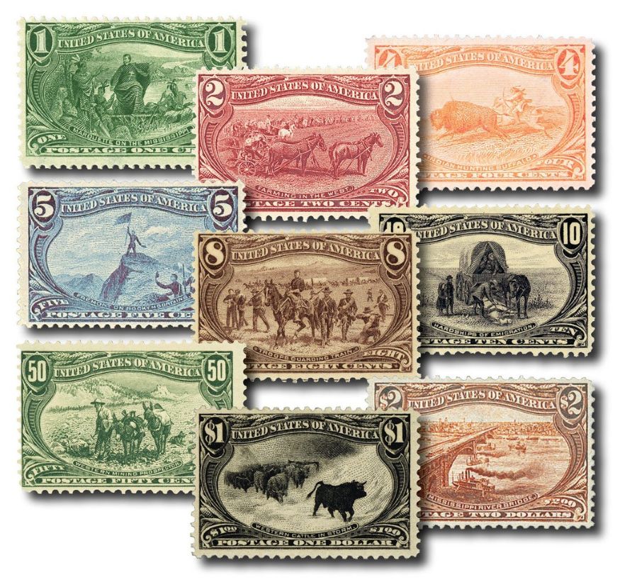 In 1898 the U.S. Postmaster General authorized a nine stamp set of stamps to promote and commemorate the 1898 Trans-Mississippi & International Exposition. The 1 cent to $2.00 stamps were supposed to be printed in two colors, but because the Spanish-American War broke out they were only printed with one color.