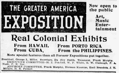 In August 1898, the Spanish-American war ended, and in late November, Spain accepted the American terms for peace. In December, President McKinley said he favored Omaha hosting another expo during 1899 for the nation to share its new “possessions” gained from the war. That included Cuba, Guam, Philippines, and Puerto Rico.(Adam Fletcher Sasse, October 9, 2015 "A History of the 1899 Greater America Exposition in North Omaha").