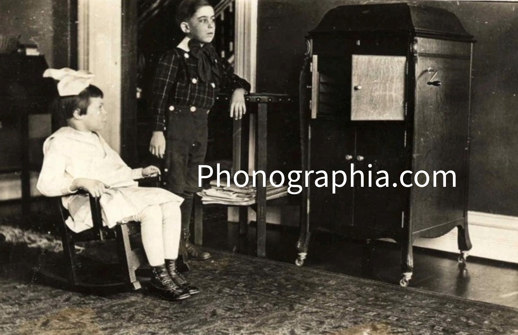 Little Girl and boy with Victrola inside their home ca. 1920 (PM-2281). |
