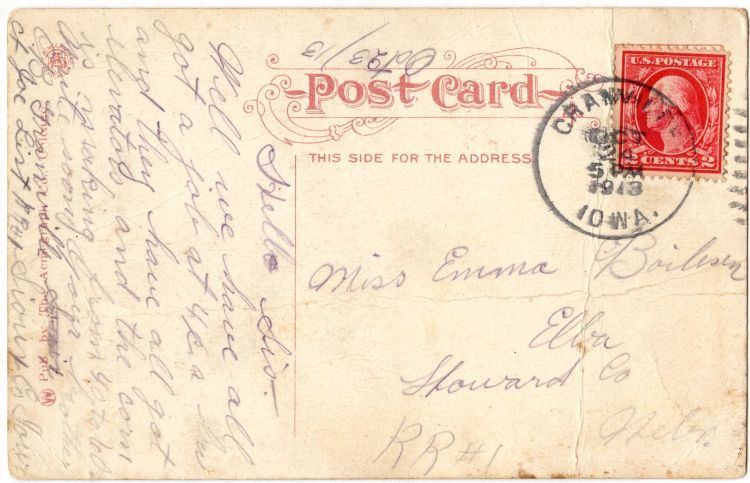 Chris Boilesen's postcard to Sister Emma, postmarked from Granville, Iowa, October 23, 1913.