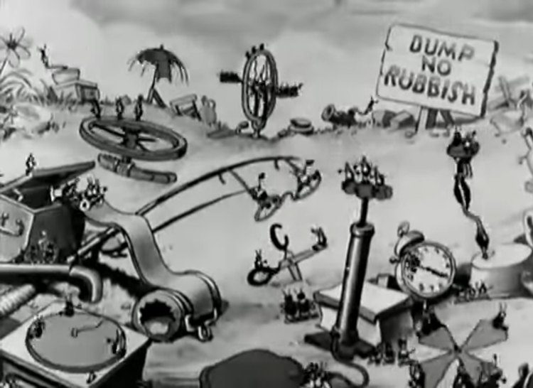 Bugs in Love Layout Drawing (Walt Disney, 1932). The insect inhabitants of Junkville have taken to heart the phrase "trash into treasure." They have repurposed what looks to be a garbage dump into a functioning amusement park, complete with swing set, a Ferris wheel, and a slide - just to name a few of the many rides. The story concerns an amorous young bug couple who are courting - and the attempt by a well-dressed crow to eat them both. Though a sound film in the proper sense of the word, the story is told mostly through pantomime. This film is notable in that it was the last Silly Symphony to be shot in black and white...