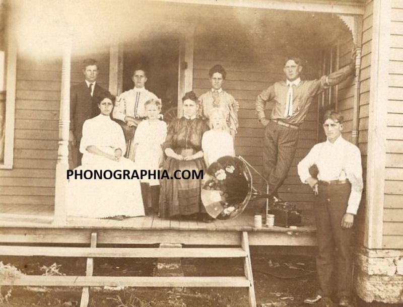 Family portrait on porch with cylinder phonograph and Edison records, ca. 1910 (PM-2285). |